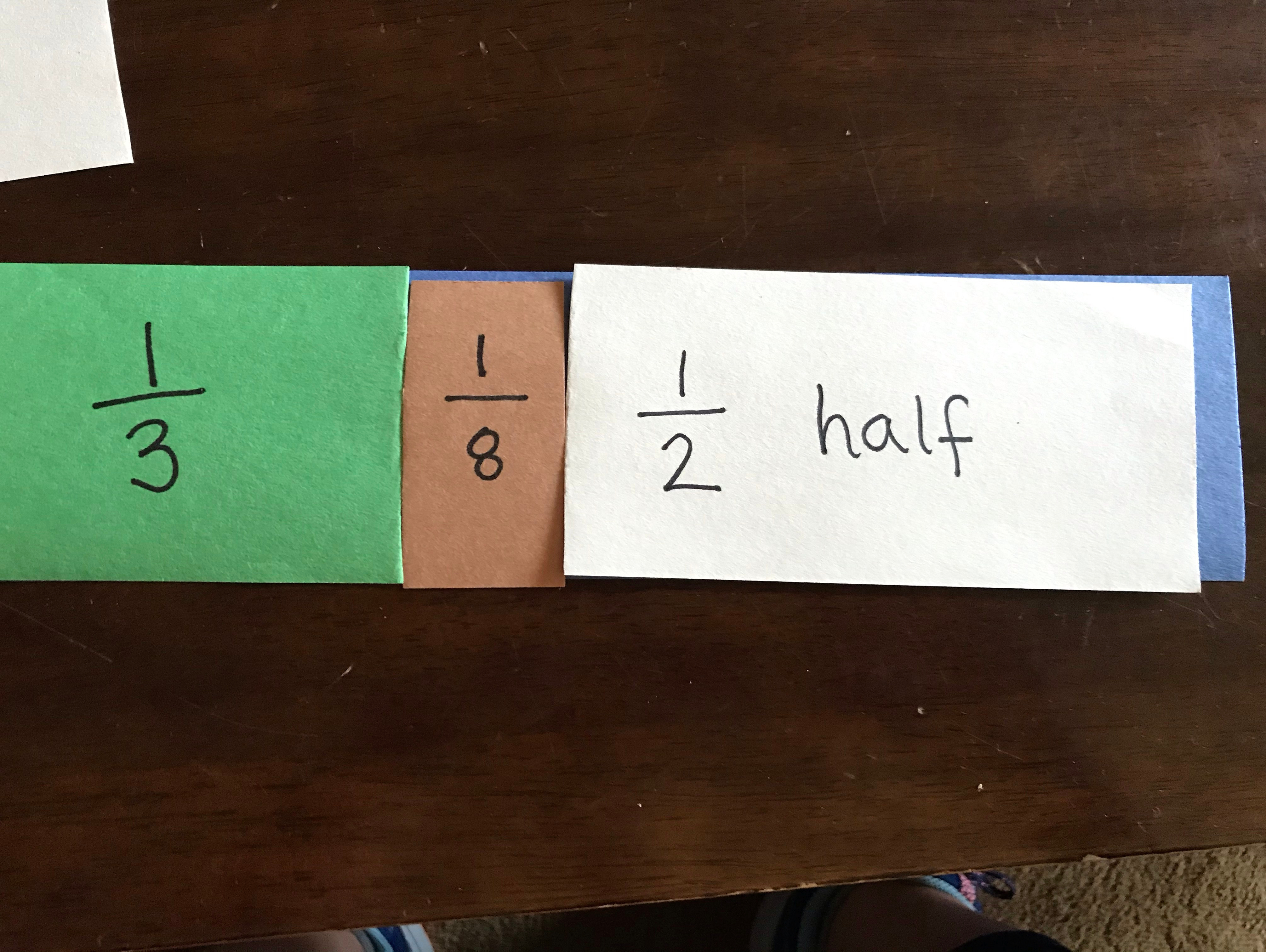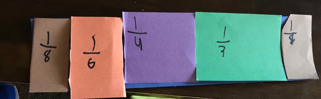 - Using the sharpie, label the 6 faces (one fraction on each face) of the cube as follows: 1/2, 1/3, 1/4, 1/6, 1/8 and 1/16. Reflecting back, I would have swapped the 1/16 out for 1/12. May have to try this next week…