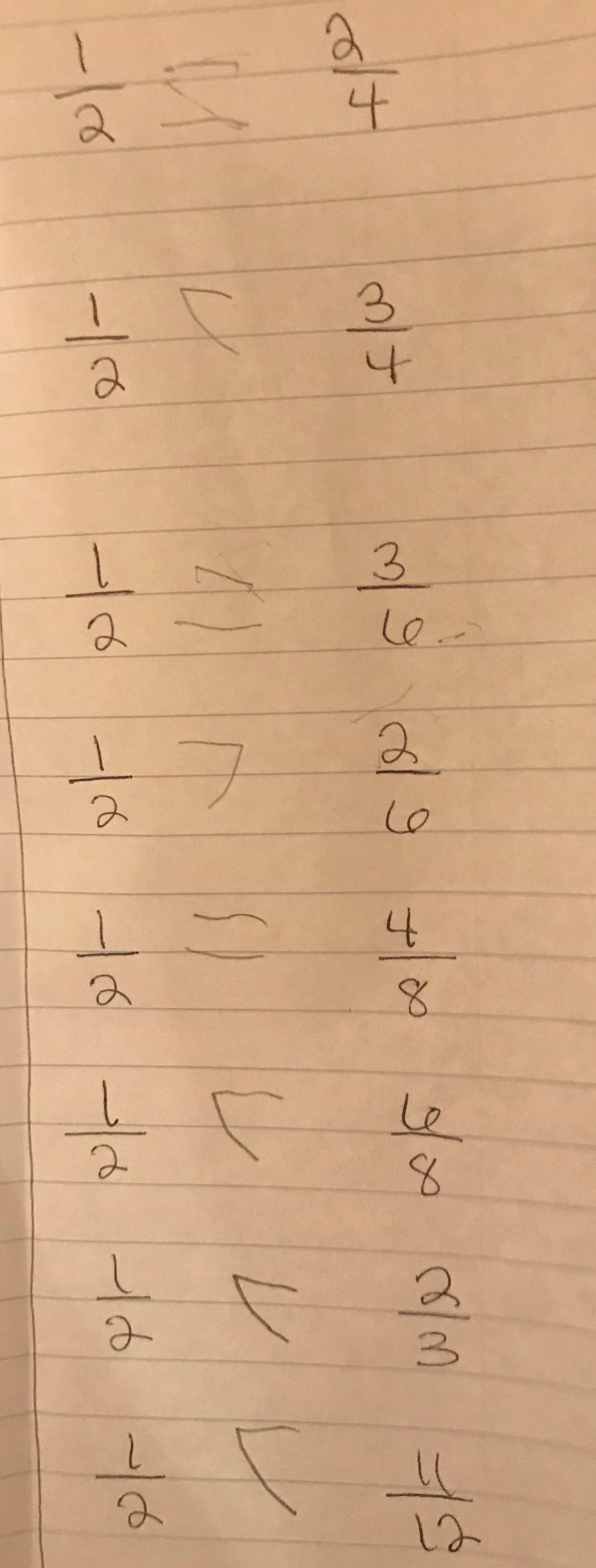 - I gave him the problems below. Each one compares 1/2 to other fractions. 1/2 is considered a “benchmark fraction”. It is a great one to use for estimation and relating to the size of other fractions. We looked at each pair individually. Is the fraction greater than, less than, or equal to half? How do you know? Notice the first 6 pairs start with the equivalent relationship, to push Chris into using half to reason about the very next pair of fractions with the same denominator. The last three pairs were to see if he would apply the “comparing to half” strategy. Below is a video of his thinking.